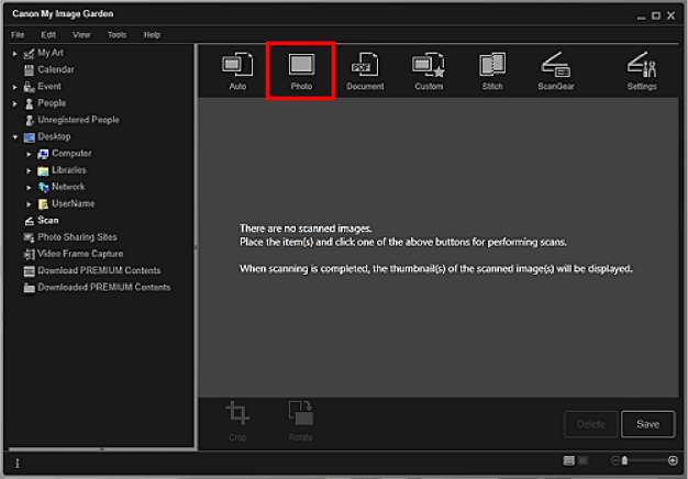 Осуществляется переход к окну Сканировать (Scan). 4. Щелкните Фото (Photo).