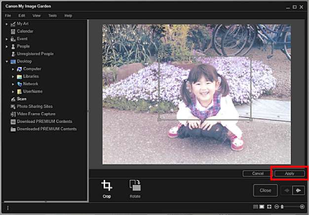 2. Растяните белую рамку на изображении для настройки области обрезки и щелкните Применить (Apply).