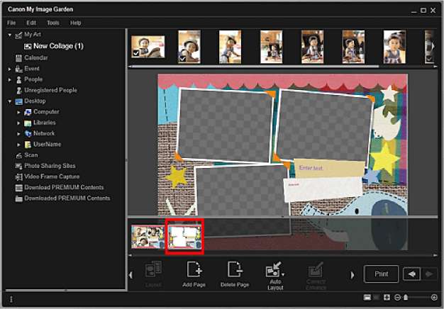 В окне Мои работы (My Art) можно постранично изменять макет объектов.