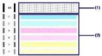 Выполните оценку шаблона для проверки сопел и очистите печатающую головку, если необходимо. 1. Убедитесь, что в шаблоне нет отсутствующих линий (1) или белых полос (2).