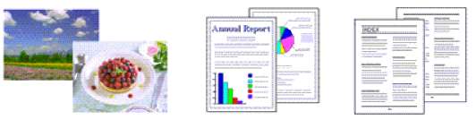 Принтер воспроизводит полутона с помощью различных сочетаний мелких точек, которые соответствуют различным оттенкам. В методе Градации (Dither) полутона воспроизводятся расположением точек в определенном порядке. В методе Диффузия (Diffusion) полутона воспроизводятся расположением точек в случайном порядке. Если выбран режим Авто (Auto), данные печатаются с использованием метода передачи полутонов, наиболее подходящего для выбранного качества печати.