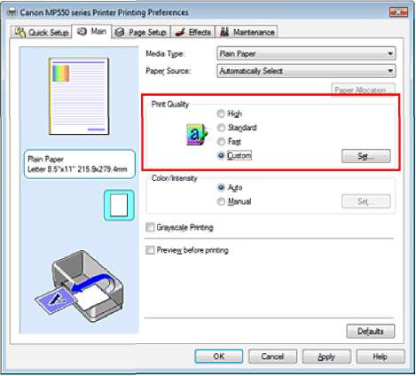Выберите значение Другое (Custom) для параметра Качество печати (Print Quality) на вкладке Главная (Main) и нажмите кнопку Задать... (Set...).