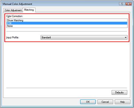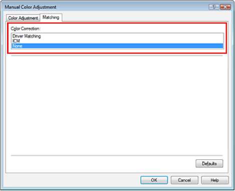 Перейдите на вкладку Согласование (Matching) и выберите значение ICM для параметра Корректировка цвета (Color Correction).