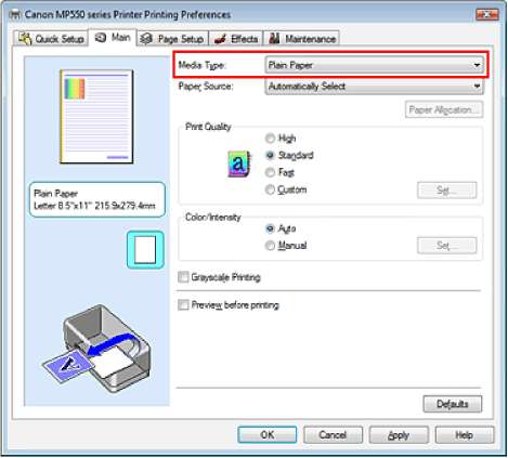 Выберите тип носителя, загруженного в принтер, в списке Тип носителя (Media Type) на вкладке Главная (Main).