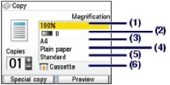 Настройки формата страницы, типа носителя, качества печати, автоматической регулировки яркости и т.п. сохраняются и отображаются при выборе меню Копирование (Copy) в следующий раз, даже если питание выключалось.