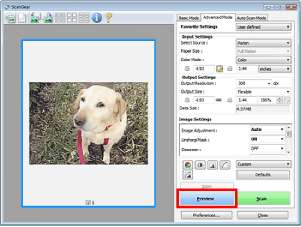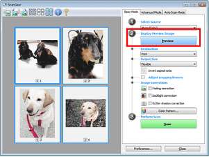 Эскизы предварительных изображений появятся в области предварительного просмотра. Изображения автоматически обрезаются (определяются области сканирования) в соответствии с размером документа.