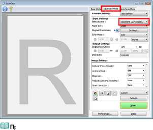 2. Выберите вкладку Расш. режим (Advanced Mode), затем выберите значение Документ (УАП одностороннее) (Document (ADF Simplex)) для параметра Выбор источника (Select Source).