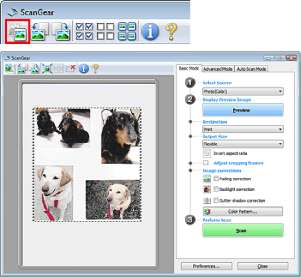 В режимах программы ScanGear (драйвер сканера) Основной режим (Basic Mode) и Расш. режим (Advanced Mode) можно выполнять одновременное сканирование двух или нескольких фотографий (небольших документов), помещенных на планшет.