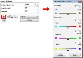 На вкладке Расш. режим (Advanced Mode) программы ScanGear (драйвера сканера) щелкните («Насыщенность/баланс цвета» (Saturation/Color Balance)).