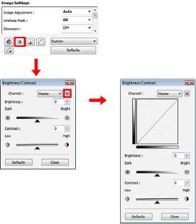 На вкладке Расш. режим (Advanced Mode) программы ScanGear (драйвера сканера) щелкните («Яркость/контрастность» (Brightness/Contrast)).