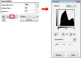 На вкладке Расш. режим (Advanced Mode) программы ScanGear (драйвера сканера) щелкните («Гистограмма» (Histogram)).