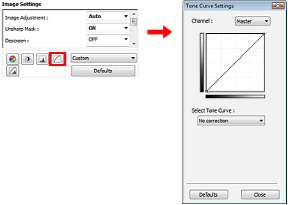 На вкладке Расш. режим (Advanced Mode) программы ScanGear (сканера драйвера) щелкните («Настройки кривой тона» (Tone Curve Settings)).