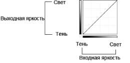 Входные данные средних тонов растянуты по направлению к светлым участкам на выходе, в результате чего при просмотре на мониторе изображение получается более светлым.