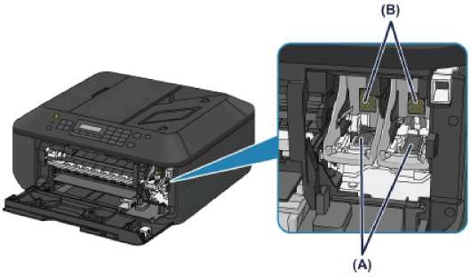 Не прикасайтесь к деталям (A) и находящимся за ними электрическим контактам (B). При прикосновении к ним устройство может выполнять печать неправильно.