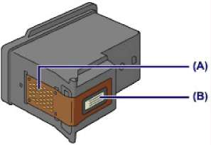 Не прикасайтесь к электрическим контактам (A) и соплам печатающей головки (B). При прикосновении к ним устройство может выполнять печать неправильно.