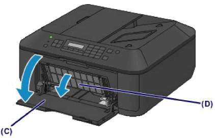 1. Убедитесь, что питание включено, откройте переднюю крышку (C), а затем откройте лоток приема бумаги (D).