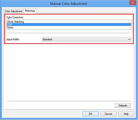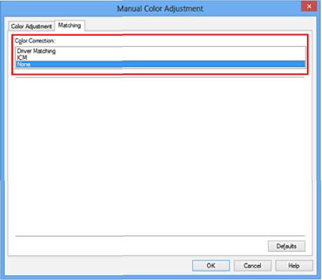 Перейдите на вкладку Согласование (Matching) и выберите значение ICM (Сопоставление профиля ICC (ICC Profile Matching)) для параметра Корректировка цвета (Color Correction).
