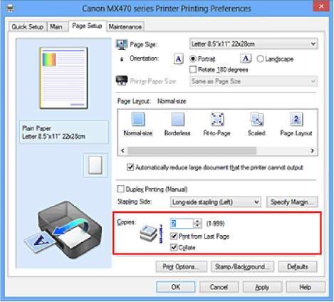Ниже описана процедура указания количества копий и порядка печати страниц: Можно также задать количество копий на вкладке Быстрая установка (Quick Setup).