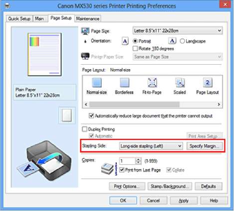 Проверьте положение поля для переплета в разделе Сторона переплета (Stapling Side) на вкладке Страница (Page Setup).
