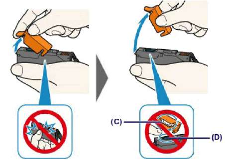 Не касайтесь внутренней стороны оранжевого защитного колпачка (C) или открытого отверстия для чернил (D). Если до них дотронуться, можно испачкать руки.