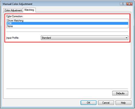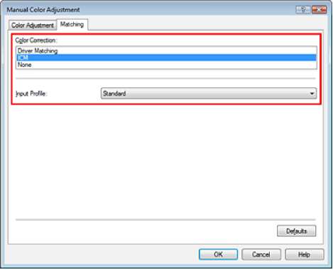Если для печати изображения вы указываете в прикладной программе индивидуально созданный профиль или профиль для специальной бумаги Canon, выберите значение Нет (None) в меню Корректировка цвета (Color Correction) драйвера принтера.