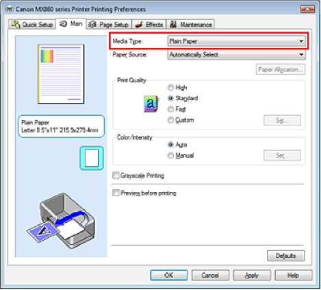 Выберите тип носителя, загруженного в принтер, в списке Тип носителя (Media Type) на вкладке Главная (Main).