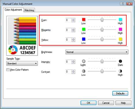 Поскольку эта функция настраивает цветовой баланс путем изменения соотношения чернил для каждого цвета, она меняет общий цветовой баланс документа. Чтобы значительно изменить баланс цвета, используйте прикладную программу. Используйте драйвер принтера только для незначительного изменения баланса цвета.
