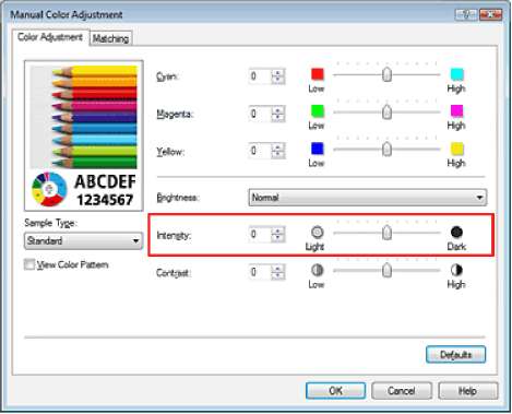 Перемещение регулятора Интенсивность (Intensity) вправо делает цвета интенсивнее (темнее). Перемещение регулятора влево делает цвета слабее (ярче). Можно также непосредственно ввести значение, определяющее положение регулятора. Введите значение в диапазоне от -50 до 50.