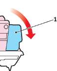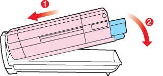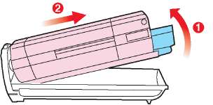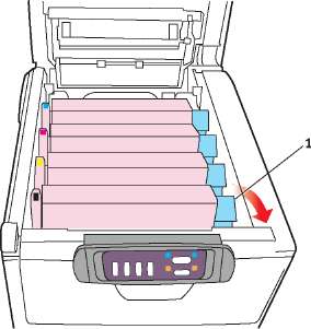 Мягко нажмите на него, чтобы обеспечить его жесткую фиксацию, и нажмите на цветной рычаг (1) в направлении тыльной части принтера. Это заблокирует его на месте и освободит тонер в блок печатного барабана.