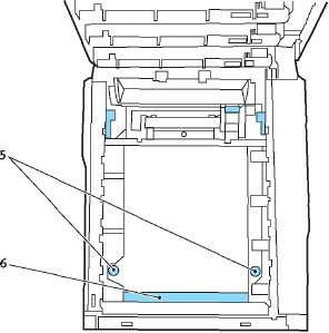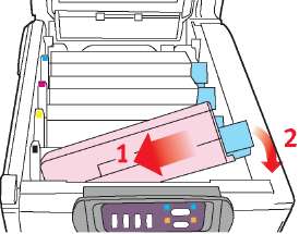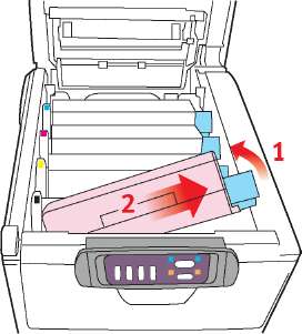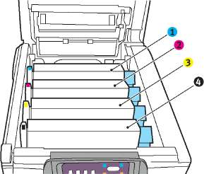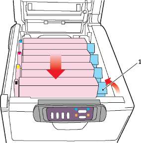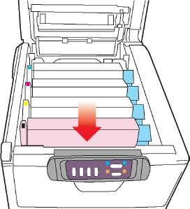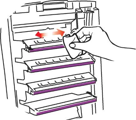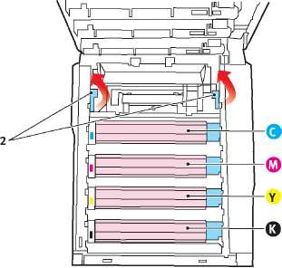 9. Установите на место четыре печатных барабана в той же самой последовательности, в какой они были извлечены: бирюзовый (ближайший к заднему краю), пурпурный, желтый и черный (ближайший к переднему краю).
