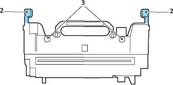 Переместите два удерживающих рычага (2) в направлении тыльной части принтера для фиксации печки на месте.