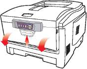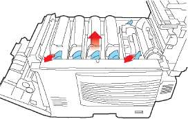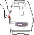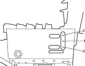 Слегка приподнимите край боковой крышки в двух указанных точках и потяните его на себя и вверх, полностью снимая крышку с принтера. Слегка поднимите крышку для удаления ее из принтера. Осторожно положите ее на одну сторону в устойчивом положении.