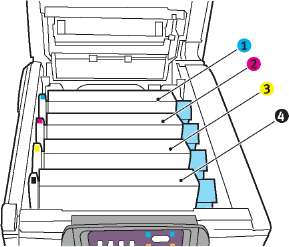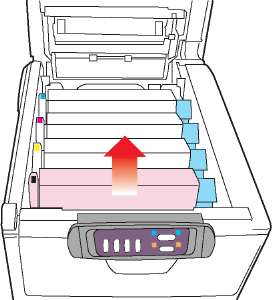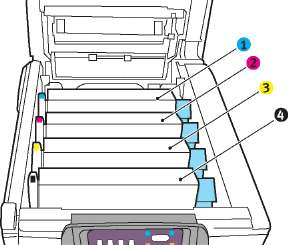 расположенного ближе всего к печке, верните четыре печатных барабана назад в полость барабана, убедившись в правильном порядке цветов.