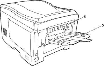 8. Откройте лоток заднего выхода бумаги (5) и проверьте наличие бумаги на пути заднего выхода (6).