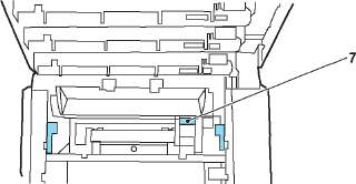 • Если лист находится внизу этого отсека и его тяжело достать, то, возможно, он все еще удерживается печкой. В этом случае поднимите верхнюю крышку, найдите рычаг освобождения валов печки и прижмите его вниз (7).
