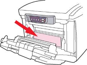 Если лист почти полностью вошел в печку (виден только короткий край листа), то не пытайтесь вытянуть его обратно. Выполните следующий шаг для удаления листа из задней части принтера.