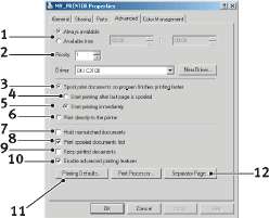 9. Определяет, что буфер не будет удалять документы после их завершения. Это позволяет отправлять документы на принтер из буфера вместо того, чтобы вновь печатать их из прикладной программы. Если вы используете эту возможность, то вам потребуется больше места на диске компьютера.