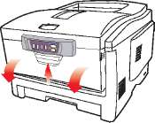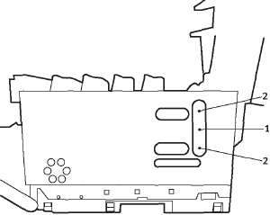Слегка приподнимите край боковой крышки в двух указанных точках и потяните его на себя и вверх, полностью снимая крышку с принтера. Слегка поднимите крышку для удаления ее из принтера. Осторожно положите ее на одну сторону в устойчивом положении.