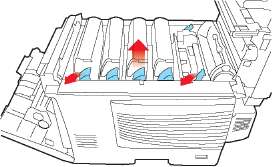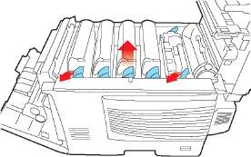 5. Слегка приподнимите край боковой крышки в двух указанных точках и потяните его на себя и вверх, полностью снимая крышку с принтера. Положите ее на одну сторону в устойчивом положении.