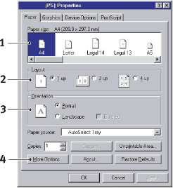 Окно, которое открывается при щелчке по кнопке Properties (Свойства), зависит от установленного драйвера принтера. Драйвер PostScript предлагает иные возможности выбора по сравнению с драйвером PCL.