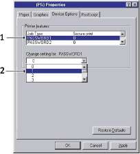 2. В "Printer Features (Свойства принтера)" выберите "Пароль 1" (1 выше справа), а затем цифру от 0 до 9 для изменения настроек в раскрывающемся списке (2 выше справа). Повторите эту же операцию для паролей 2 - 4.