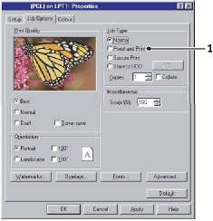 В окне драйвера во вкладке Job Options (Опции задания) выберите Proof and Print (Проверка и печать) (1).