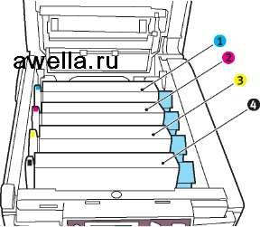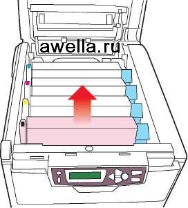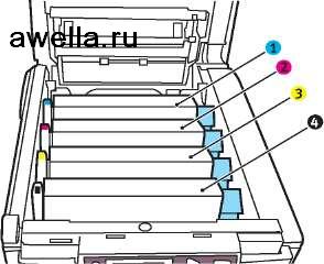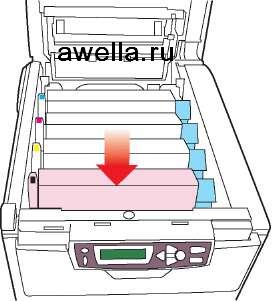 расположенного ближе всего к печке, верните четыре печатных барабана назад в полость барабана, убедившись в правильном порядке цветов.
