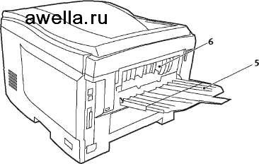 8. Откройте лоток заднего выхода бумаги (5) и проверьте наличие бумаги на пути заднего выхода (6).