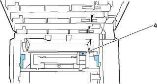 Для удаления страницы, застрявшей при входе в печку (3), отделите задний край страницы от ремня, нажмите рычаг освобождения валов печки (4) в направлении вперед и вниз для освобождения захваченной печкой бумаги и вытащите лист наружу. Затем вновь верните рычаг освобождения валов в верхнее положение.