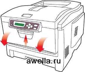 7. Опустите верхнюю крышку вниз, но не нажимайте ее до защелкивания. Это защитит печатные барабаны от излишнего воздействия комнатного света во время проверки оставшихся областей на наличие застрявшей бумаги.