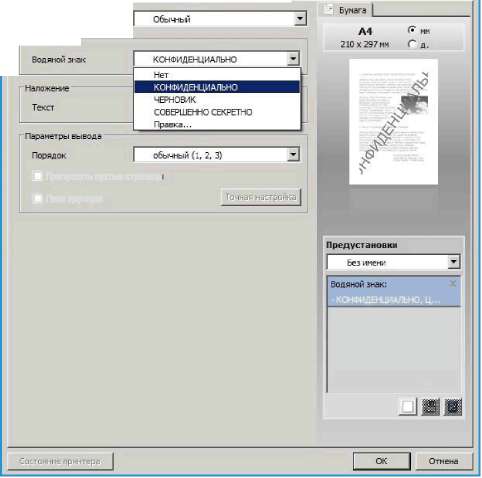 • Пробная печать: используется при печати более чем одной копии работы. Позволяет сначала распечатать одну копию, а затем, после проверки - остальные.