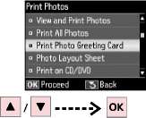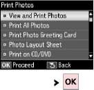 Просмотр и печать фото, Печатать все фото, Печать фотооткрытки, Лист макета фото, Печать на CD/DVD, Печать пробной страницы, Показ слайд-шоу, Копир-ние/восстан-ие фото, Выбор места *9