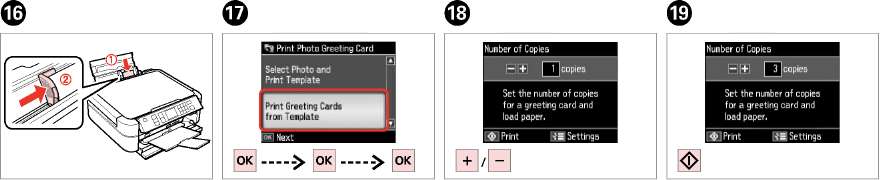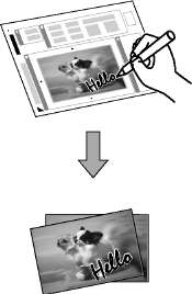 Можно создавать пользовательские открытки с рукописными текстами, используя шаблон A4. Сначала напечатайте шаблон, напишите текст открытки, а затем отсканируйте шаблон, чтобы напечатать открытки.
