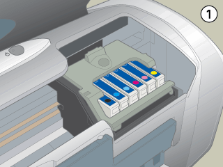 Нажмите кнопку чернил. Печатающая головка передвинется в позицию замены. Световой индикатор питания начнет мигать. В обозначенном меткой, осталось мало чернил или он опустел.